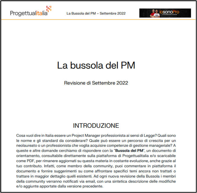 Cosa vuol dire in Italia essere un Project Manager professionista ai sensi di Legge? Quali sono le norme e gli standard da considerare? La "Bussola del PM" è un documento di orientamento, consultabile in piattaforma e/o scaricabile come PDF, per rimanere aggiornati su questa materia in costante evoluzione, anche grazie al tuo contributo. Infatti, come membro della community puoi direttamente postare sotto al documento commenti e suggerimenti su come affrontare specifici temi ancora non trattati o trattare in maggior dettaglio quelli esistenti.