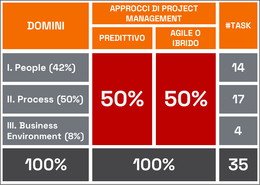 Circa la metà dell'esame verte su scenari di progetto predittivi (waterfall) e l'altra metà su scenari agili o ibridi, oggetto anche del PMBoK Edizione 7.